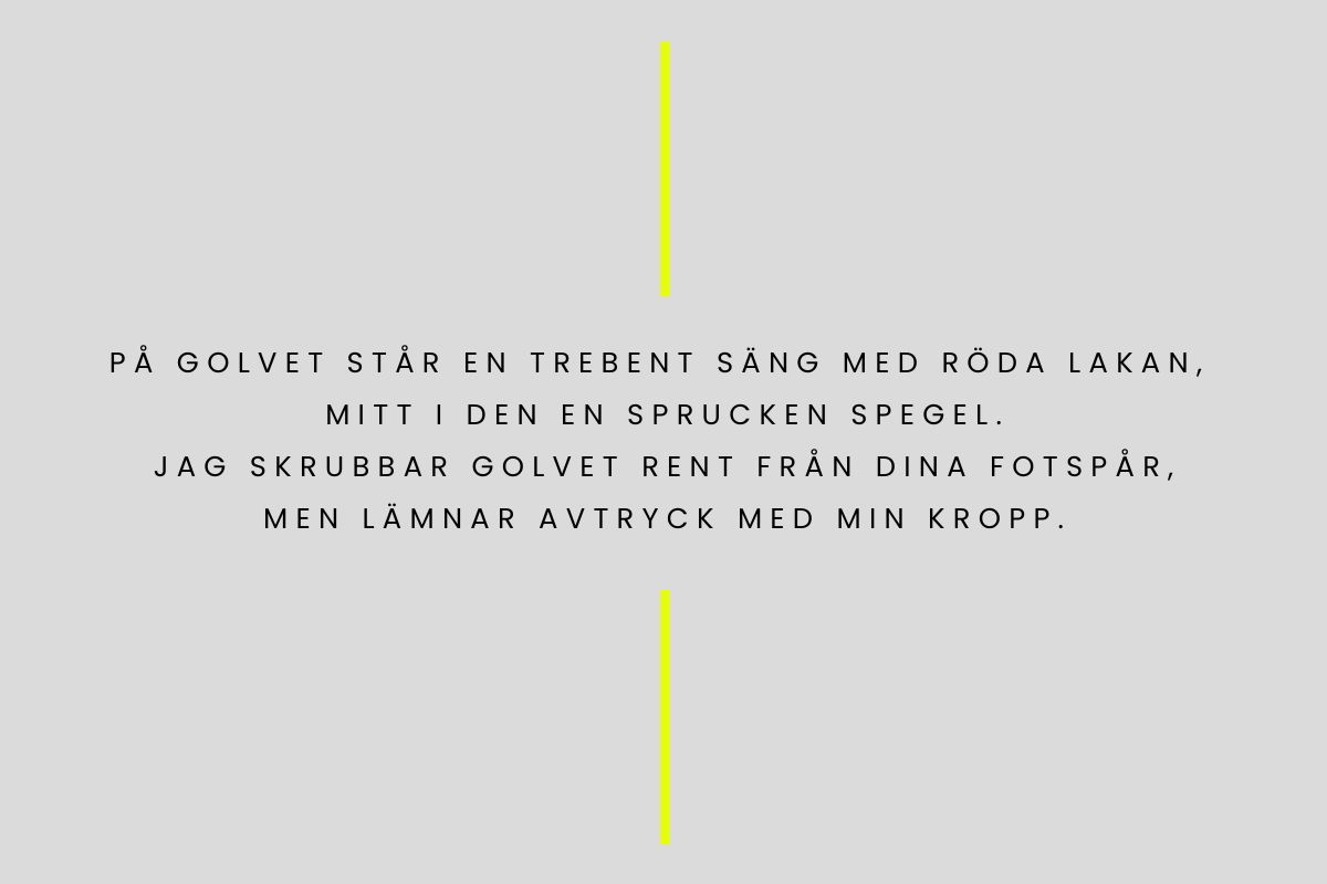 Jag heter Alice och kommer från en liten bruksort i Dalsland. Nu bor jag i Göteborg i en alldeles för trång lägenhet tillsammans med min sambo. De senaste åren har jag sysslat med både konst och text. Det tycker jag är roligt. Jag jobbar på ett café och studerar kreativt skrivande på distans. Jag gillar långa bad och romantiska komedier. Just nu läser jag Knausgårds Min kamp och har precis börjat kolla på senaste säsongen av Love is Blind.