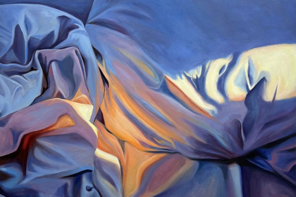 "Genom min praktik bearbetar jag min vardag som transperson och bristen på trygga rum genom att skapa mitt eget. Sängen är en metafor, ett inre rum men också en fysisk plats där min identitet är obestridd. Jag låter mjuka lakan bli bärare av min historia. Ett taktilt möte där subjekt och objekt blir ett. I måleriet uttrycker textiliernas graciösa och otvungna rörelser min längtan efter kroppslig frihet. Hud och ärr får genom penseldrag förmedla berättelsen och låta avbildningar av en okonventionell kropp bli del av ett allmänt rum. Jag tillåter min identitet exponeras på mina villkor och förstärker det jag vill berätta genom färg och form."