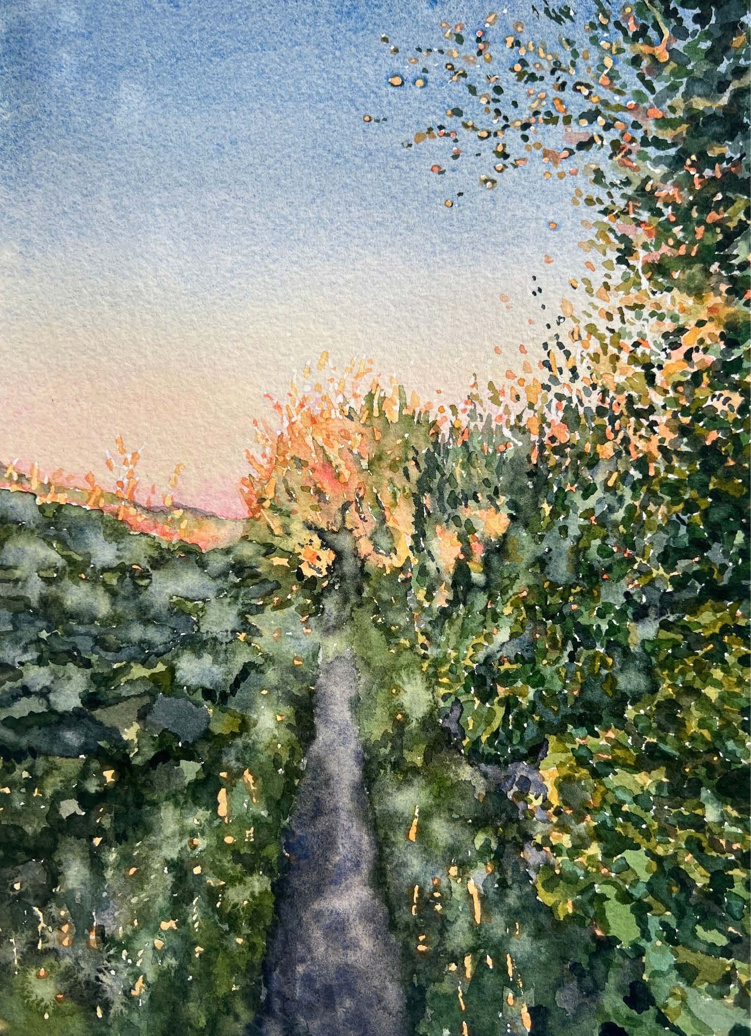 "I mitt måleri drivs jag av att leta och att finna beröringspunkter i landskapet som ligger intill havet här på västkusten. Där klippor, stenar, växtlighet och träd möts utforskar jag förhållandet mellan ljus och textur klätt i starka färger. Det fina jag upplever med just akvarell är att ständigt kunna ha en dialog med materialet där jag både måste ge och ta för att kunna komma överens med vattnet och färgerna på pappret."