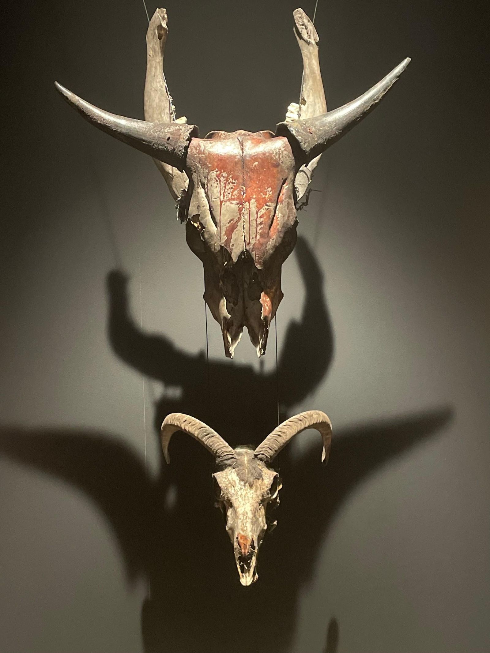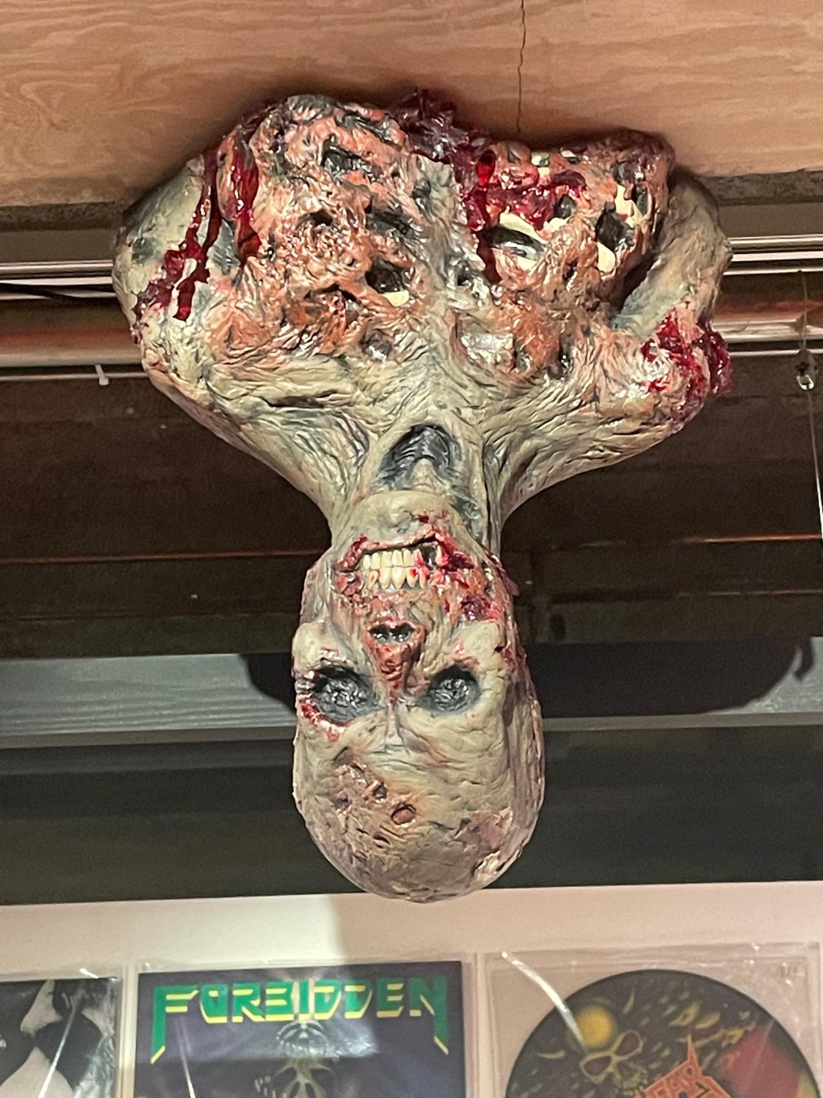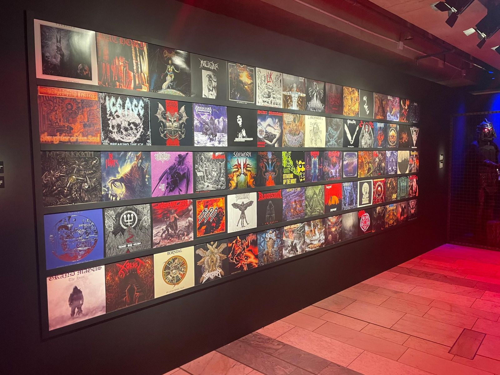 När vi kom ut ur filmrummet började själva utställningen. Vi visste inte riktigt vad man skulle förvänta sig. Hela utställningen var väldigt utspridd så man fick välja vart man skulle gå först. Det första våra ögon drogs till var en vägg full med svenska skivomslag av alla genrer och estetiska karaktärer. På väggen kunde vi se vilka detaljer det kan finnas på omslagen och hur mycket tid det läggs på bilderna. Det visar hur metall-konsten inte bara är musik utan även bildkonst.