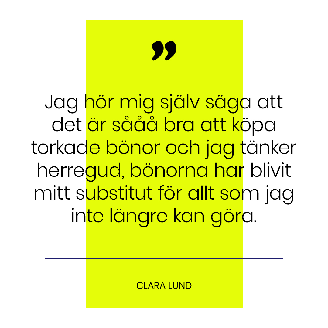 Häromveckan pratade jag med min syster i telefon. Jag var i full färd med att svälla och koka bönor, en process som tar flera dygn, och min syster svarade glatt att hon ystade egen ost till palak paneer. Trots det kände vi båda att vi kunde passa på att slå varandra en signal. Både min och min systers kalendrar har gått från proppfulla till ekande tomma och tiden det gett oss tycks vi båda ha lagt på avancerade maträtter. Jag har spenderat timmar med att skriva detaljerade handlingslistor med tusentals olika maträtter och pålägg och mellanmål en kan göra av de enorma mängder bönor jag har svällt och kokat. Jag hör mig själv säga att det är sååå bra att köpa torkade bönor och jag tänker herregud, bönorna har blivit mitt substitut för allt som jag inte längre kan göra. Jag har ett sådant behov av att ha fullt upp att jag nu bakar och kokar och planerar och letar recept tills jag får hjärtklappning. Det ständiga stresspåslaget jag haft i min kropp under så många år vill jag sorgligt nog återkomma till.