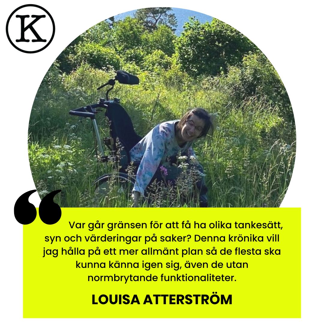 Var går gränsen för att få ha olika tankesätt, syn och värderingar på saker? Denna krönika vill jag hålla på ett mer allmänt plan så de flesta ska kunna känna igen sig, även de utan normbrytande funktionaliteter. Jag är trött på mig själv, att jag alltid utgår utifrån mitt perspektiv på världen. Vi behöver stå upp för varandra. Stå upp för att alla ska få jämlika rättigheter i en demokrati. Även om det inte gynnar mig själv något. Inte för att jag tänker på att en dag kan jag vara i någon annans situation. Nej, utan för att visa solidaritet mot mina medmänniskors olika livsvillkor. Men var går då gränsen? Hur mycket ska det påverka mitt liv när jag hjälper andra?