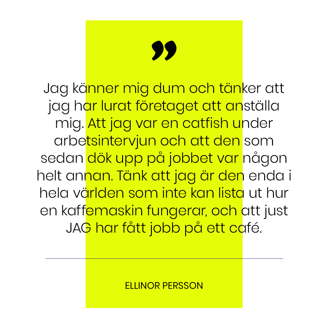 Jag stirrar på kaffemaskinen som jag inte har någon aning om hur den fungerar. Jag drar mina fingrar över knapparna och trycker slumpmässigt på en för att se vad som händer. Ingenting. Symbolerna som ska beskriva knapparnas funktion verkar inte sitta rätt, för inget av det maskinen lovar ska hända händer. Fan. Jag ser mig omkring för att försöka möta en kollegas blick och hoppas på att någon själv ska komma och visa utan att jag behöver fråga. De måste väl förstå att jag inte kan någonting? De måste väl förstå att jag behöver hjälp med precis allt? Min chef bad mig koka kaffet för tio minuter sedan och då svarade jag med min snällaste röst att visst ska jag göra det, och det hade jag tänkt också men det verkar var en omöjlighet. Jag prövar en gång till och trycker nu på alla knapparna som finns, men återigen händer ingenting. Fungerar ens kaffemaskinen? Jag känner mig dum och tänker att jag har lurat företaget att anställa mig. Att jag var en catfish under arbetsintervjun och att den som sedan dök upp på jobbet var någon helt annan. Tänk att jag är den enda i hela världen som inte kan lista ut hur en kaffemaskin fungerar, och att just JAG har fått jobb på ett café.