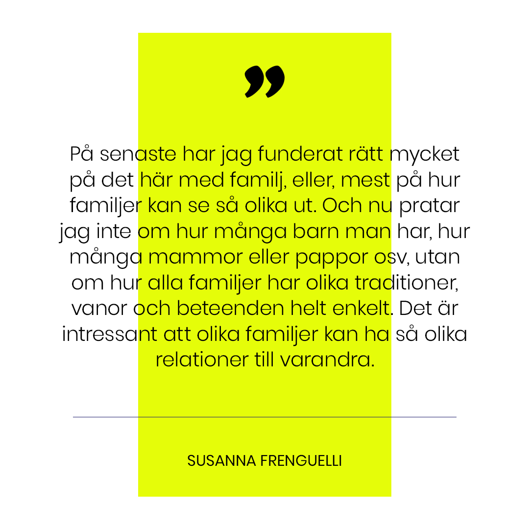 På senaste har jag funderat rätt mycket på det här med familj, eller, mest på hur familjer kan se så olika ut. Och nu pratar jag inte om hur många barn man har, hur många mammor eller pappor osv. utan om hur alla familjer har olika traditioner, vanor och beteenden helt enkelt. Det är intressant att olika familjer kan ha så olika relationer till varandra.