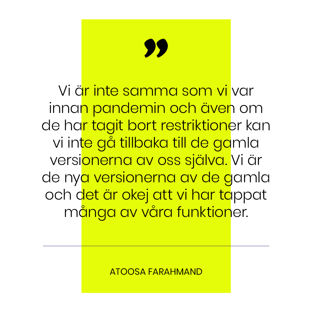 Många människor förlorade nära och kära. Jag förlorade några av mina släktingar i Iran, och jag ber dig som läsare att ta emot mina kondoleanser för förlusten av dina nära och kära och jag är ledsen för din förlust. Att förlora nära och kära är det svåraste i världen att hantera. Det är en slags smärta som du fysiskt känner över hela kroppen. Speciellt om du inte får en chans att säga hejdå innan de lämnar det här livet. Detta är något som många flyktingar upplever med eller utan pandemin. Att inte få chansen att ta farväl eller få chansen att sörja sin förlust. Sorgen kan stanna hela livet och det är viktigt att få professionell hjälp för att hitta sätt att hantera den. Och kom ihåg detta, "det är okej att inte vara okej". Vi har vårt ego för att vara den bästa versionen av oss själva, men det är okej att känna sig som skit ibland. Att gå vilse i din sorg och smärta och sedan hitta tillbaka till dig själv igen.