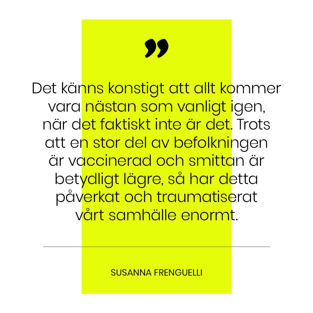 Den här veckan släpps de flesta restriktionerna i Sverige. Klubbar kommer öppna för första gången på nästan två år, konserter kommer vara aktuella, köpcentrum kommer vara knökade med folk. Det känns konstigt att allt kommer vara nästan som vanligt igen, när det faktiskt inte är det. Trots att en stor del av befolkningen är vaccinerad och smittan är betydligt lägre, så har detta påverkat och traumatiserat vårt samhälle enormt. Många kommer antagligen fortfarande ha en handsprit med sig vart de än går, akta sig för att gå för nära folk och hålla avstånd i kön. Jag kommer inte ens ihåg hur jag brukade stå i kö, stod jag verkligen mindre än en och en halv meter ifrån personen framför mig? Avståndet känns som det normala nu.