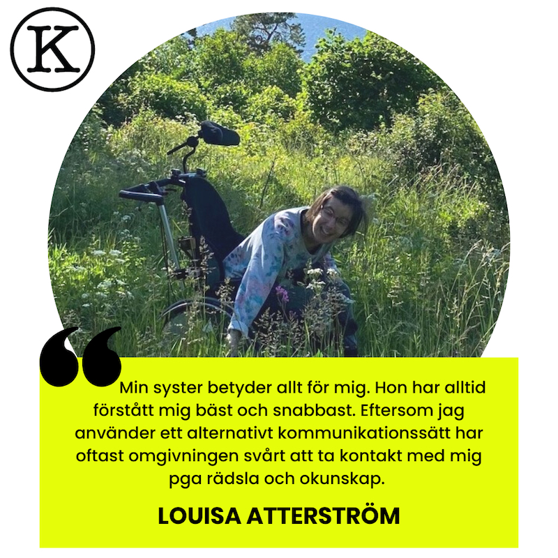 Syskon. Min syster betyder allt för mig. Hon har alltid förstått mig bäst och snabbast. Därför känner jag mig tryggast med henne. Eftersom jag använder ett alternativt kommunikationssätt har oftast omgivningen svårt att ta kontakt med mig pga rädsla och okunskap. Därför förblir jag ofta tyst. Inte för att jag vill det. Men varför ska jag ta första steget?