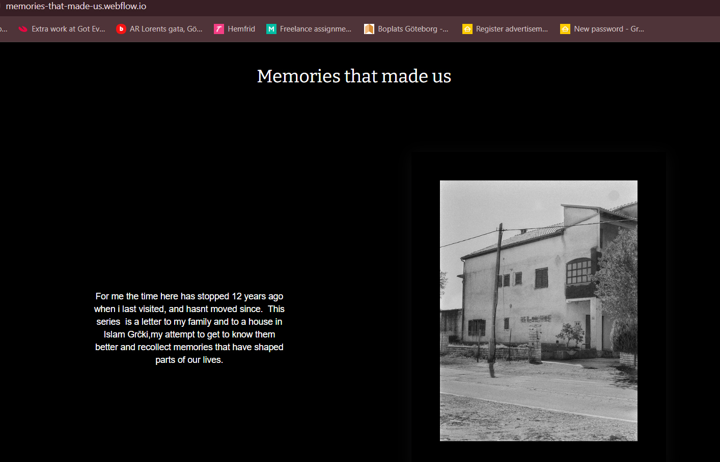 “Memories That Made Us” is an art photography project exploring my family history. It documents my mother’s hometown, Islam Grčki (near Zadar, Croatia), a place marked by the events of the 1990s war. The project combines newly shot photographs with old family images to blend past and present. Developing this project I have travelled back to Islam Grcki and stayed at the house for several days documenting the surroundings and gathering materials. I have found old photographs that were kept in the house,scanned them and combined them together with newly taken ones. I have gathered texts and old letters and wrote my own dairy entries about the place.